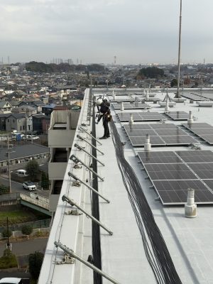屋上には☀️太陽光パネルが設置されており、その周囲に**墜落防止用のスタンション(親綱支柱)**が設置されていました。
